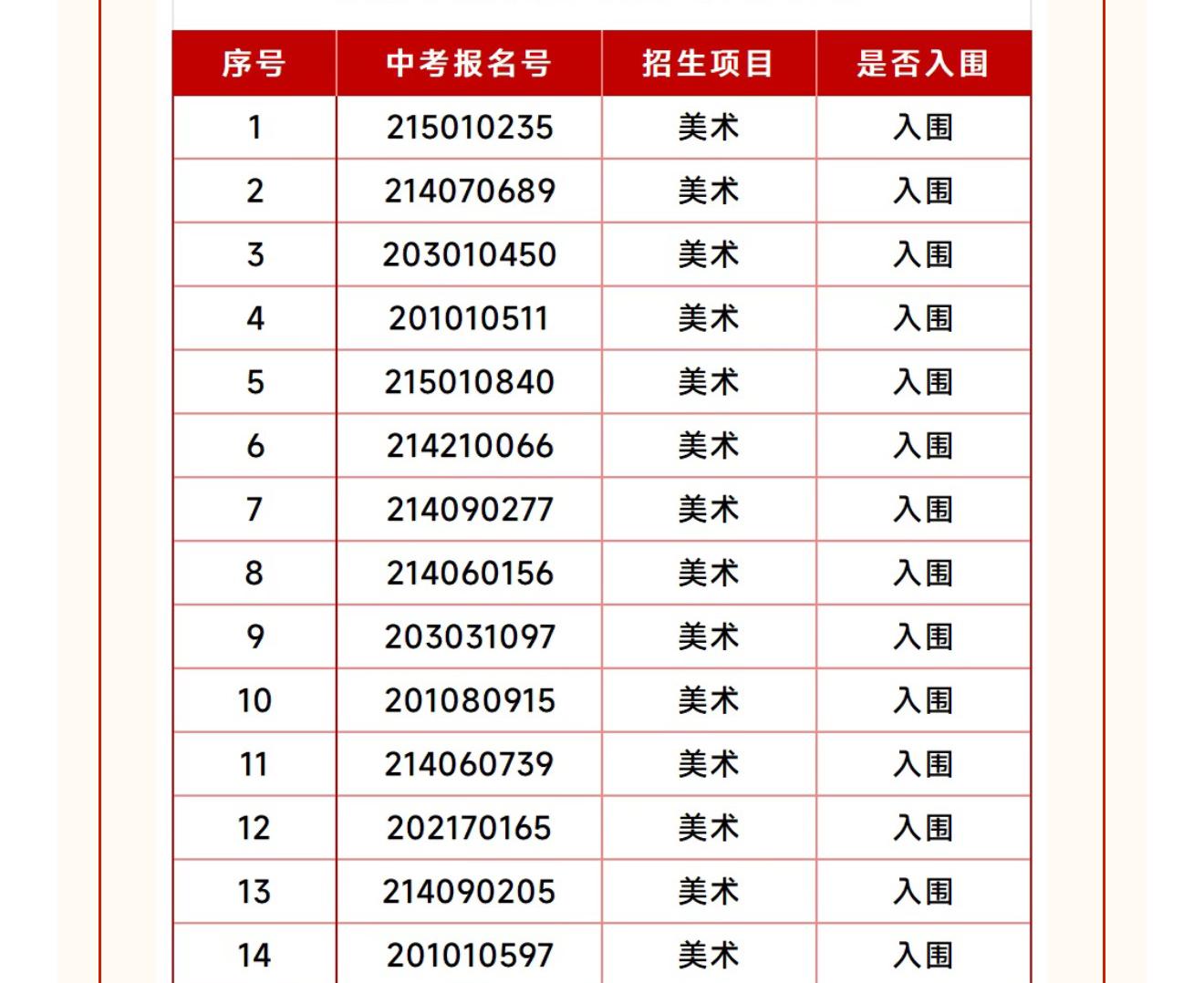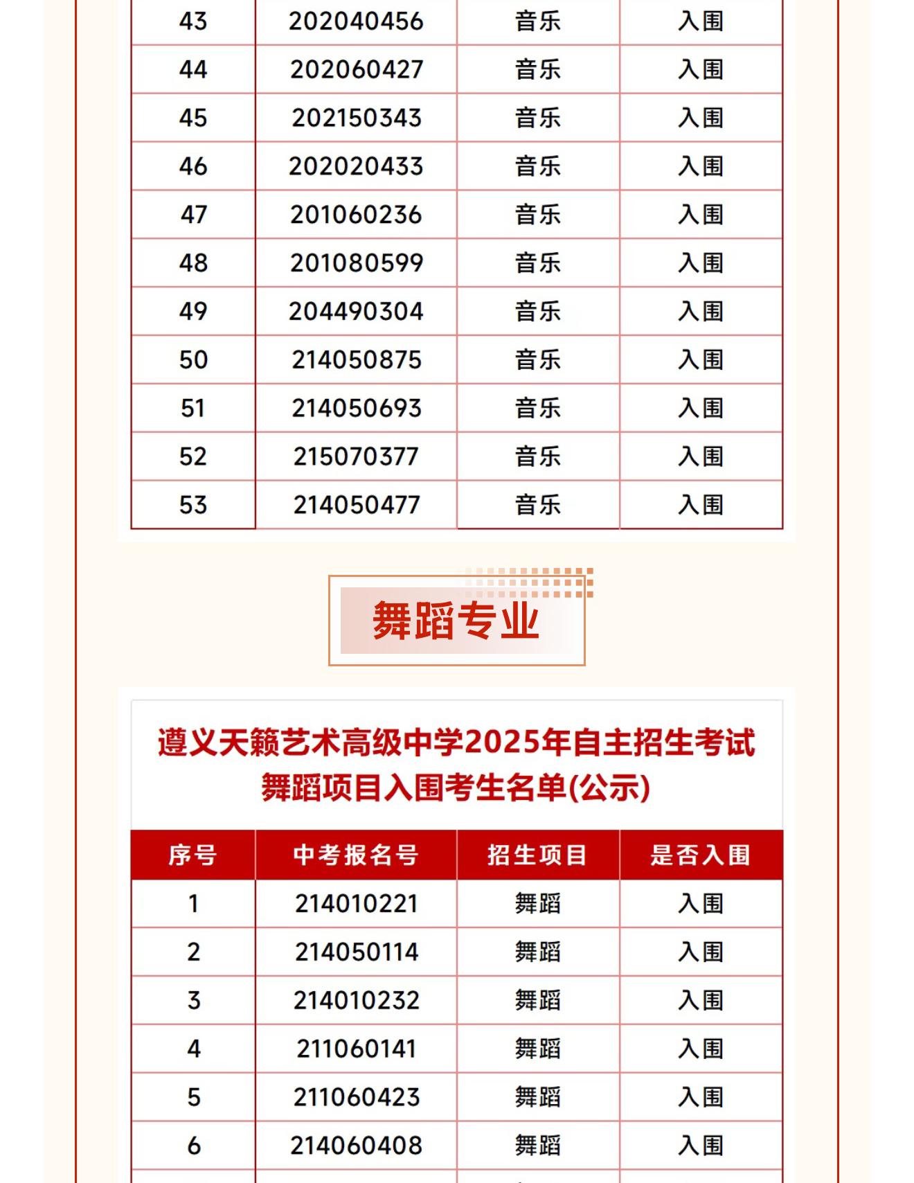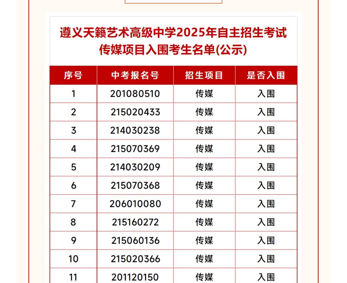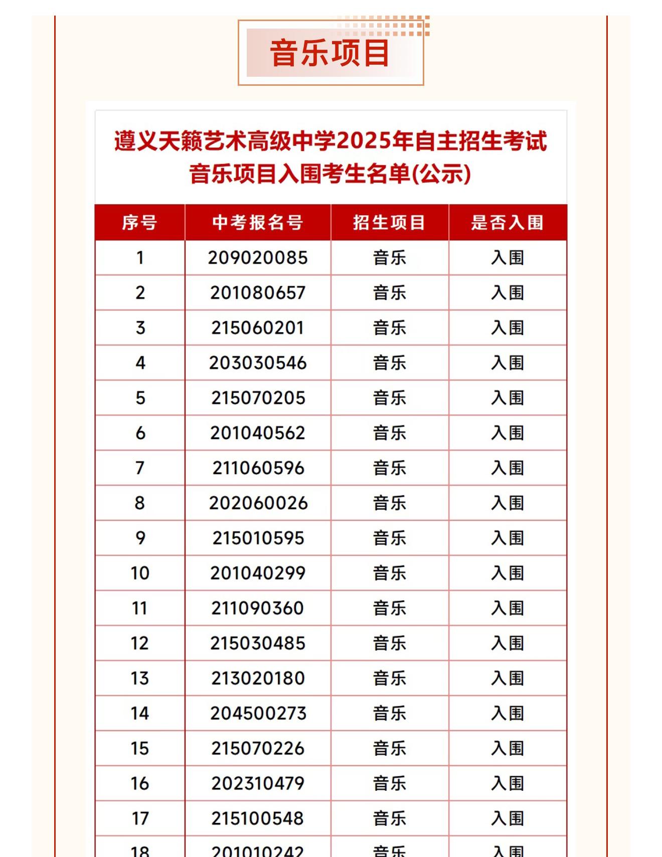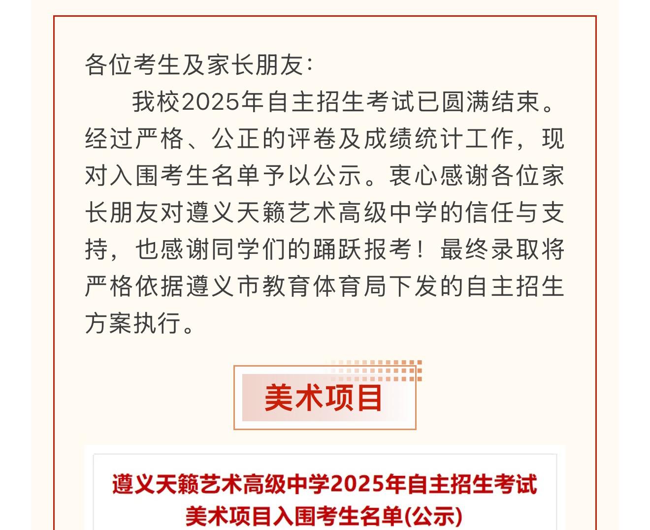遵义天籁艺术高级中学2025年自主招生入围考生名单公示