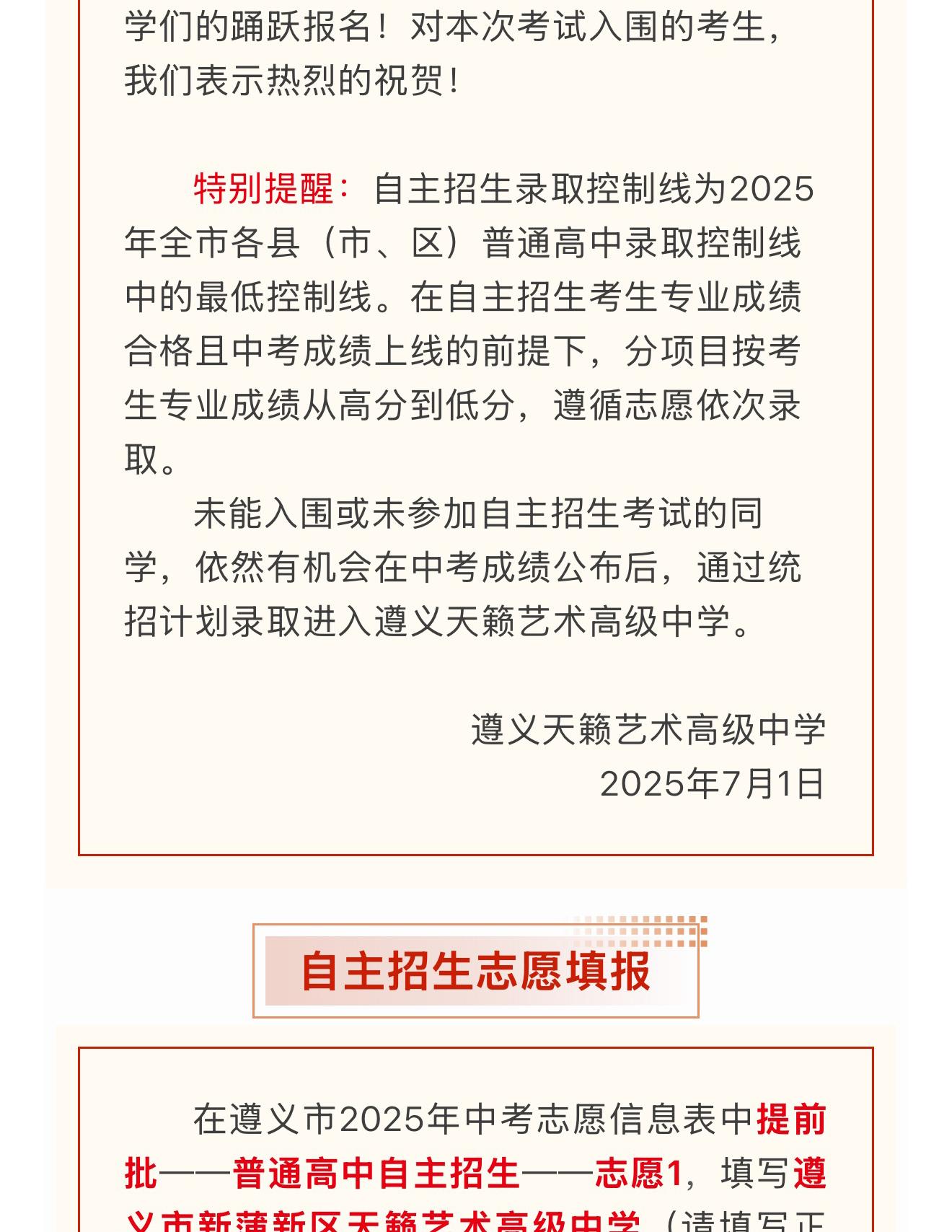 中考志愿填报指南 | 遵义天籁艺术高级中学2025年中考志愿填报问答