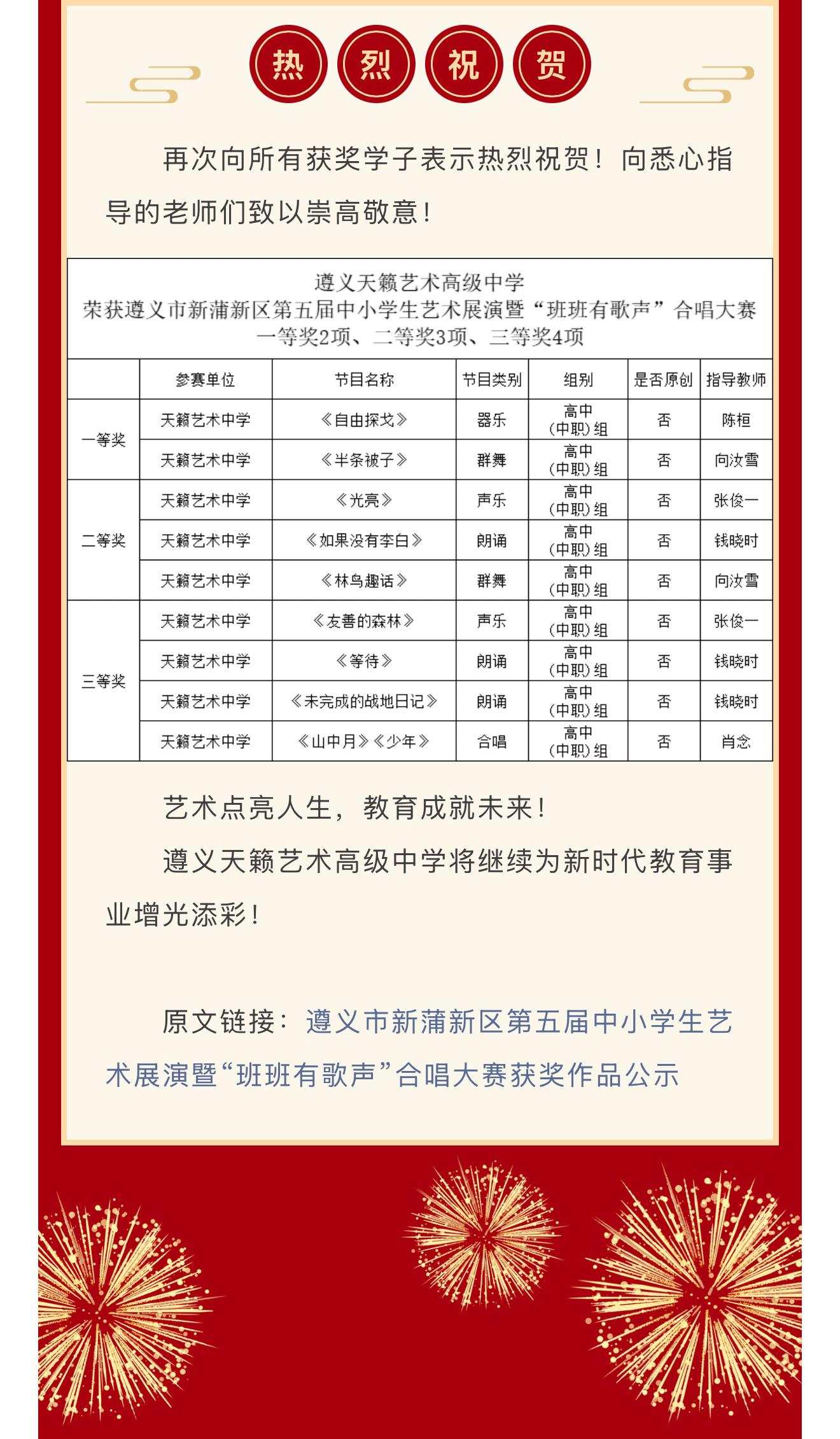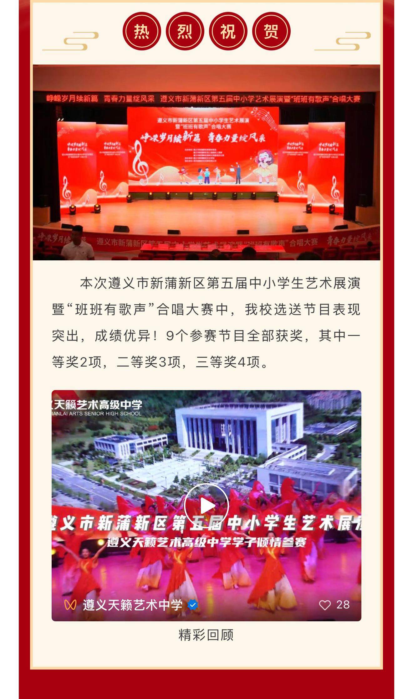 喜报!热烈祝贺我校学生在遵义市新蒲新区第五届中小学生艺术展演暨“班班有歌声”合唱大赛中勇创佳绩